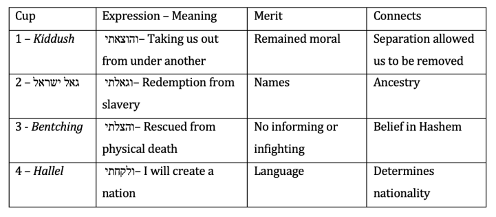 Each one of the four reasons why we merited to leave Egypt, connect to a different one of the four cups of the Pesach seder, and to one of the four types of redemption.