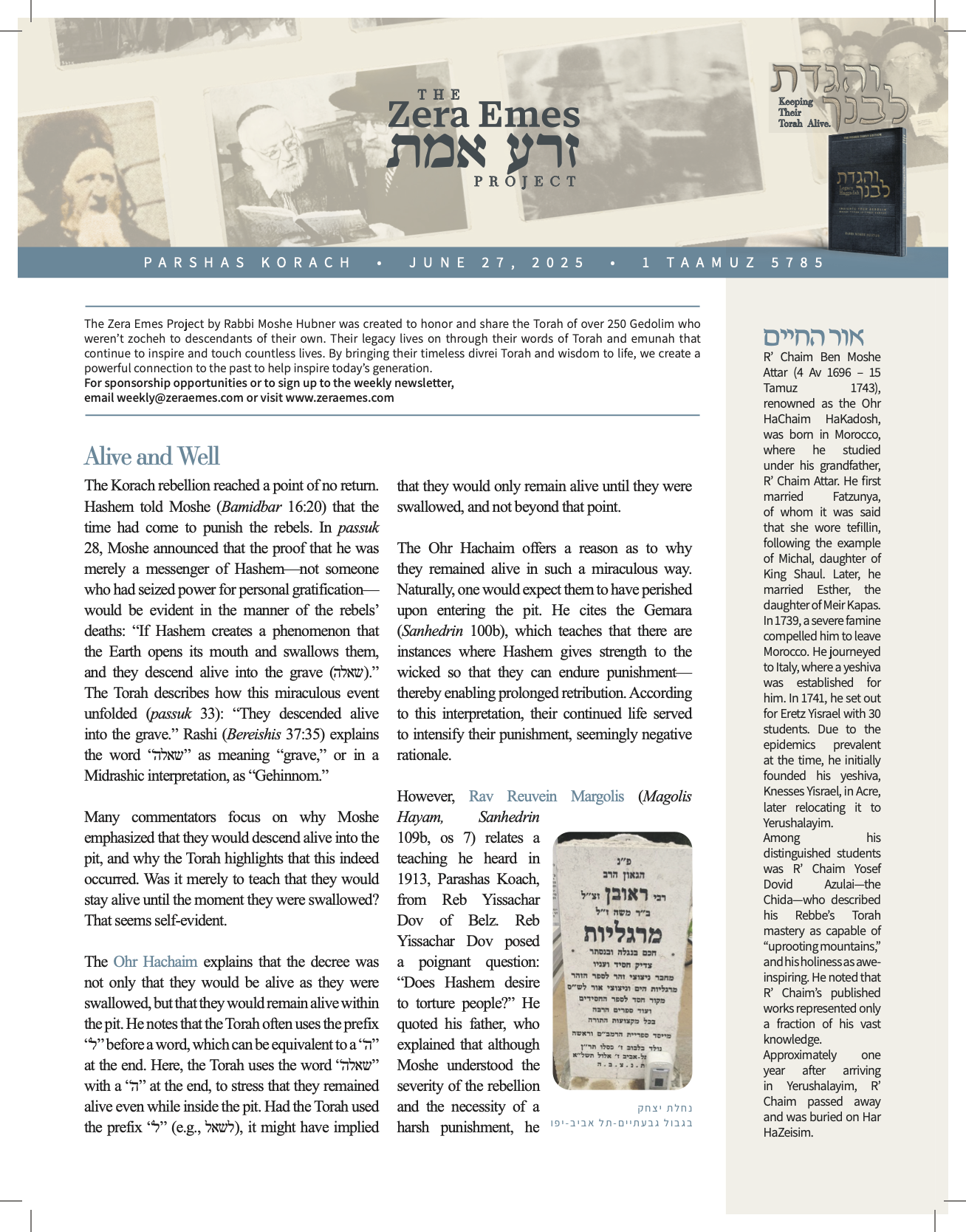 June 26, 2025June 26, 2025 CharlesB Alive and Well Korach went to the pit alive, and remained alive in it! Read Page 1 Page 2 Download Complete File (pdf) Listen Listen Nowhttps://rabbihubner.com/wp-content/uploads/2025/06/new-recording-82.m4a Watch Related