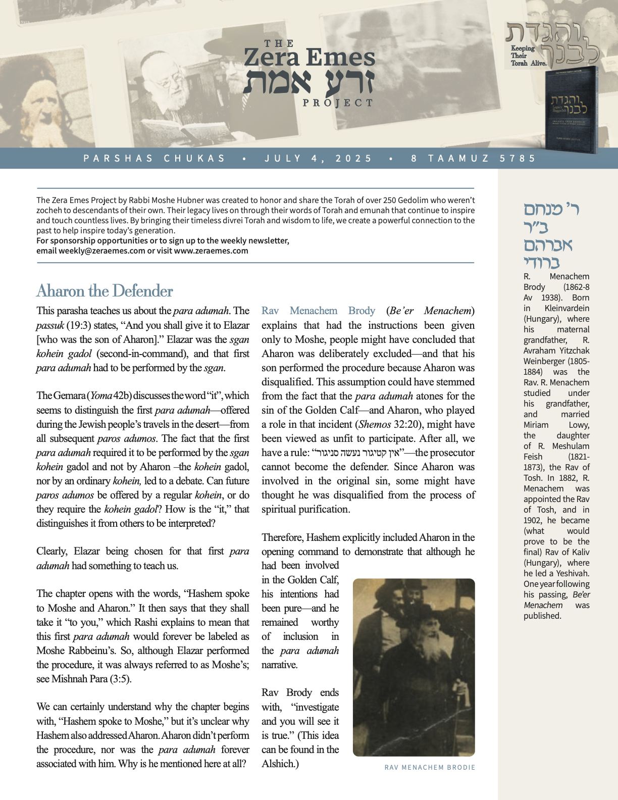 July 2, 2025July 2, 2025 CharlesB Aharon the Defender ‘Nuff Said! Read Chukat Page 1 Chukat Page 2 Download Download Chukat pdf Listen Nowhttps://rabbihubner.com/wp-content/uploads/2025/07/070225.m4a Watch Related