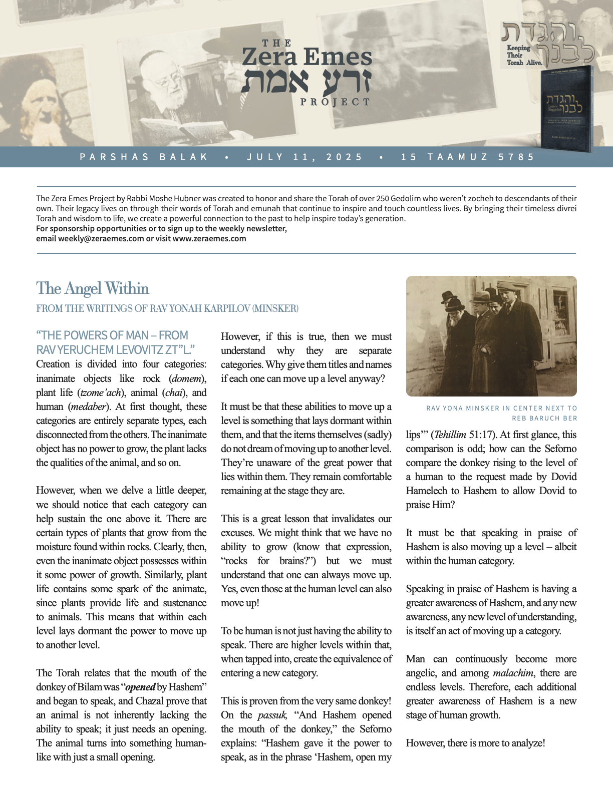 July 10, 2025July 10, 2025 CharlesB A donkey talking is equated with our davening. Moving levels. This week’s gilyon is based on a Gadol NOT mentioned in the Fisher Family Legacy Haggadah. Read Balak Page 1 Balak Page 2 Download File .pdf Listen Now: https://rabbihubner.com/wp-content/uploads/2025/07/new-recording-85.m4a Watch Related